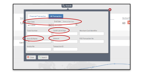 - From the drop down menu, you will see gields for "Card# Last 4 Digit", "Start Date", "End Date", "Amount", and "Store ID/Name"