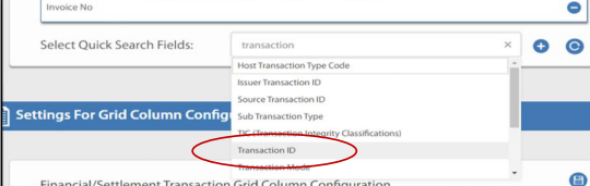 - Type in "Transaction ID" in the "Select Quick Search Fields" area in the "Setting for Financial Transaction Quick Search Configuration" section and click on it.