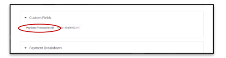 - The Transaction ID is found in the order details in the OLO portal under "Custom Fields". If no Payment Transaction ID is present, this indicates the order is a 3rd party delivery and must be refunded from the merchant online portal (Grubhub, Doordash, etc.)